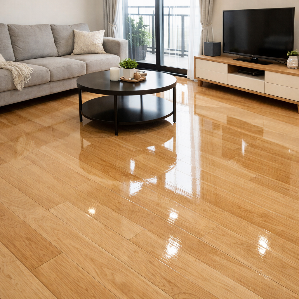 ガラスコーティングは、フローリング表面に硬質なガラス被膜を形成します。