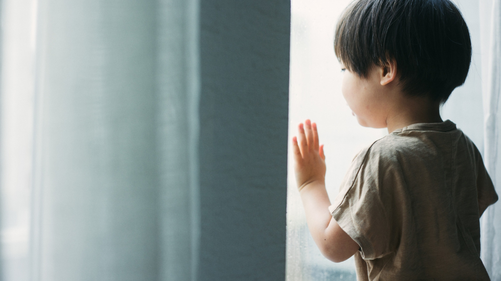 お子さまが窓に顔を近づけて外を眺める。