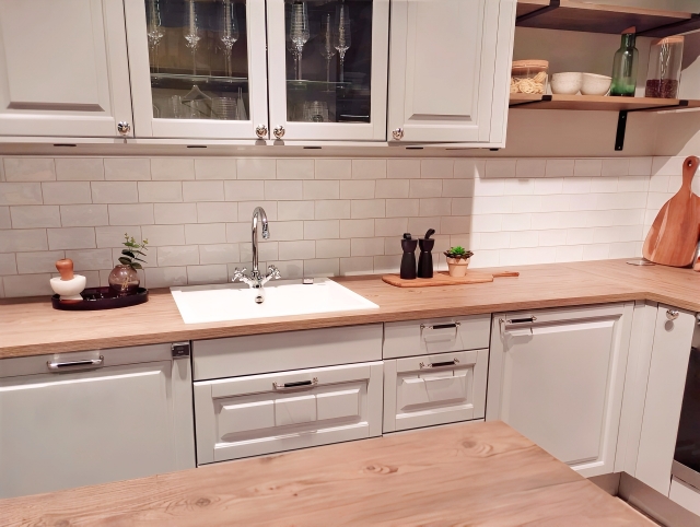 写真に写っているような、温かみのある木製(または木目調)のキッチン天板は、インテリアとしても非常に魅力的で、キッチンにカフェのような居心地の良さをもたらしてくれます。